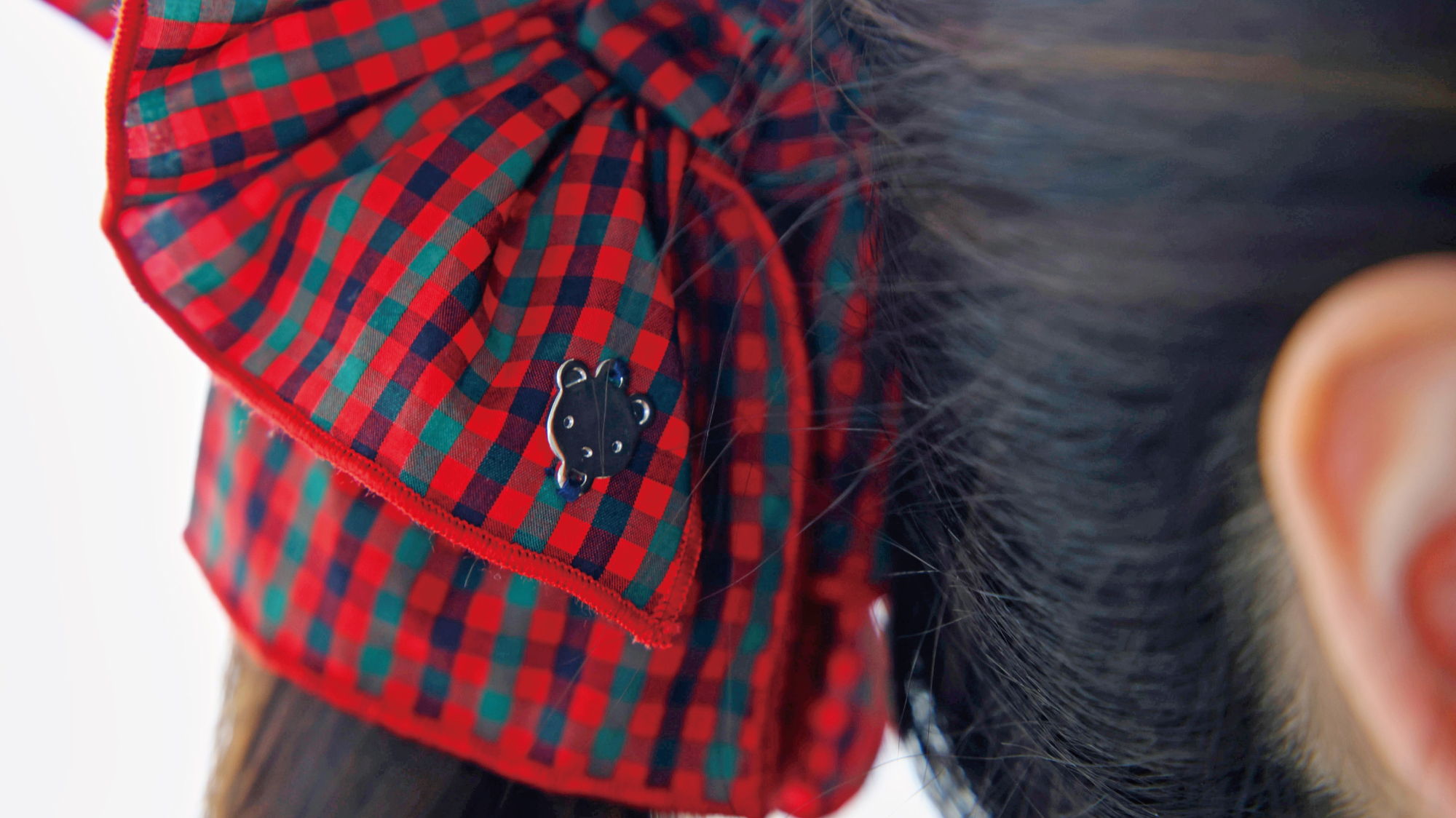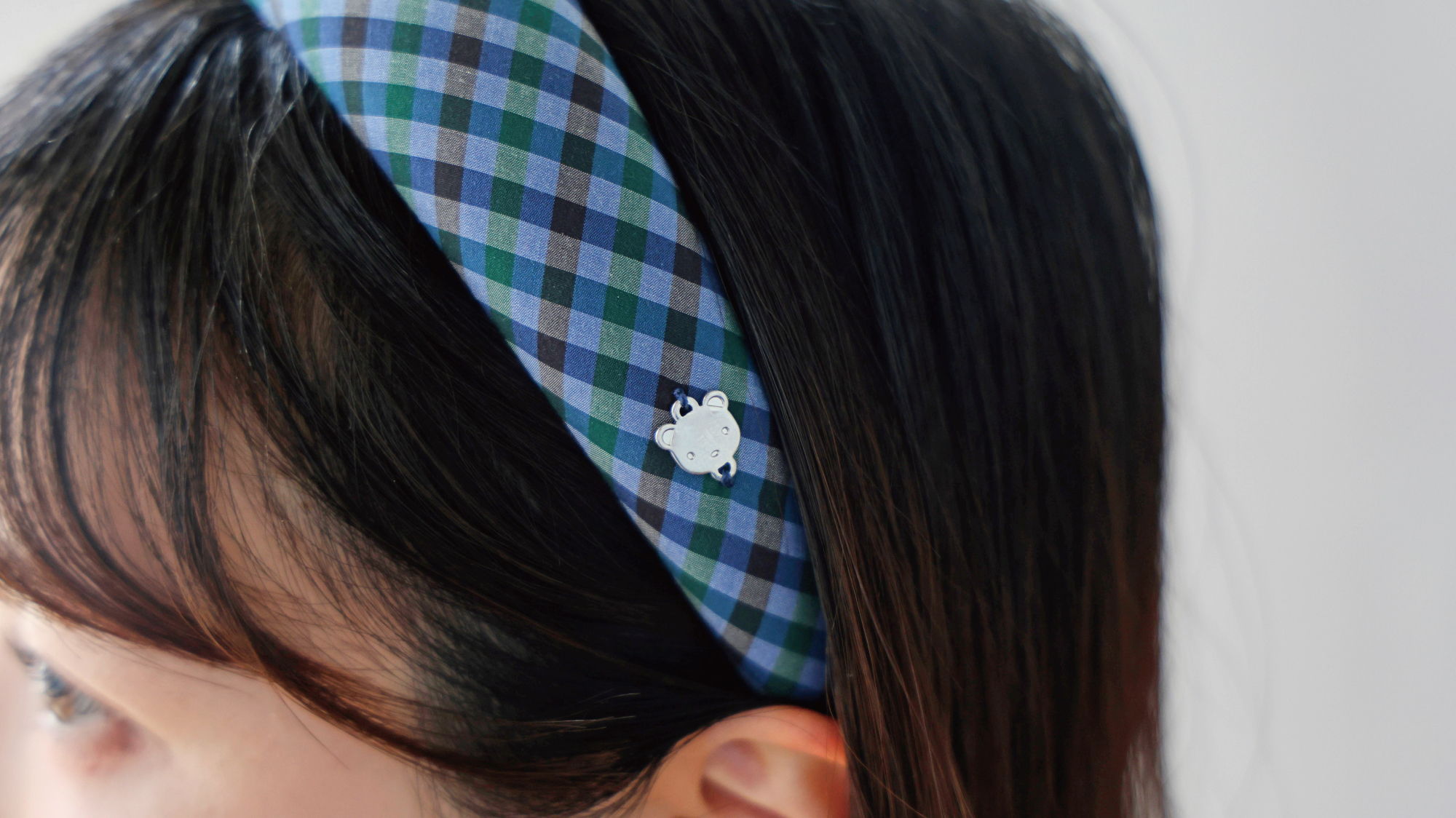 きらりと光るくまちゃんのチャームがポイントのファミリアチェックを使用したカチューシャ。