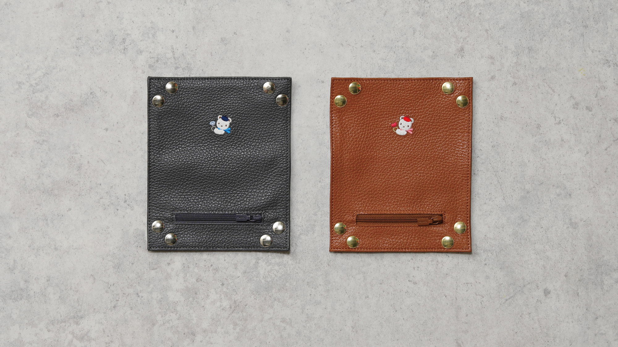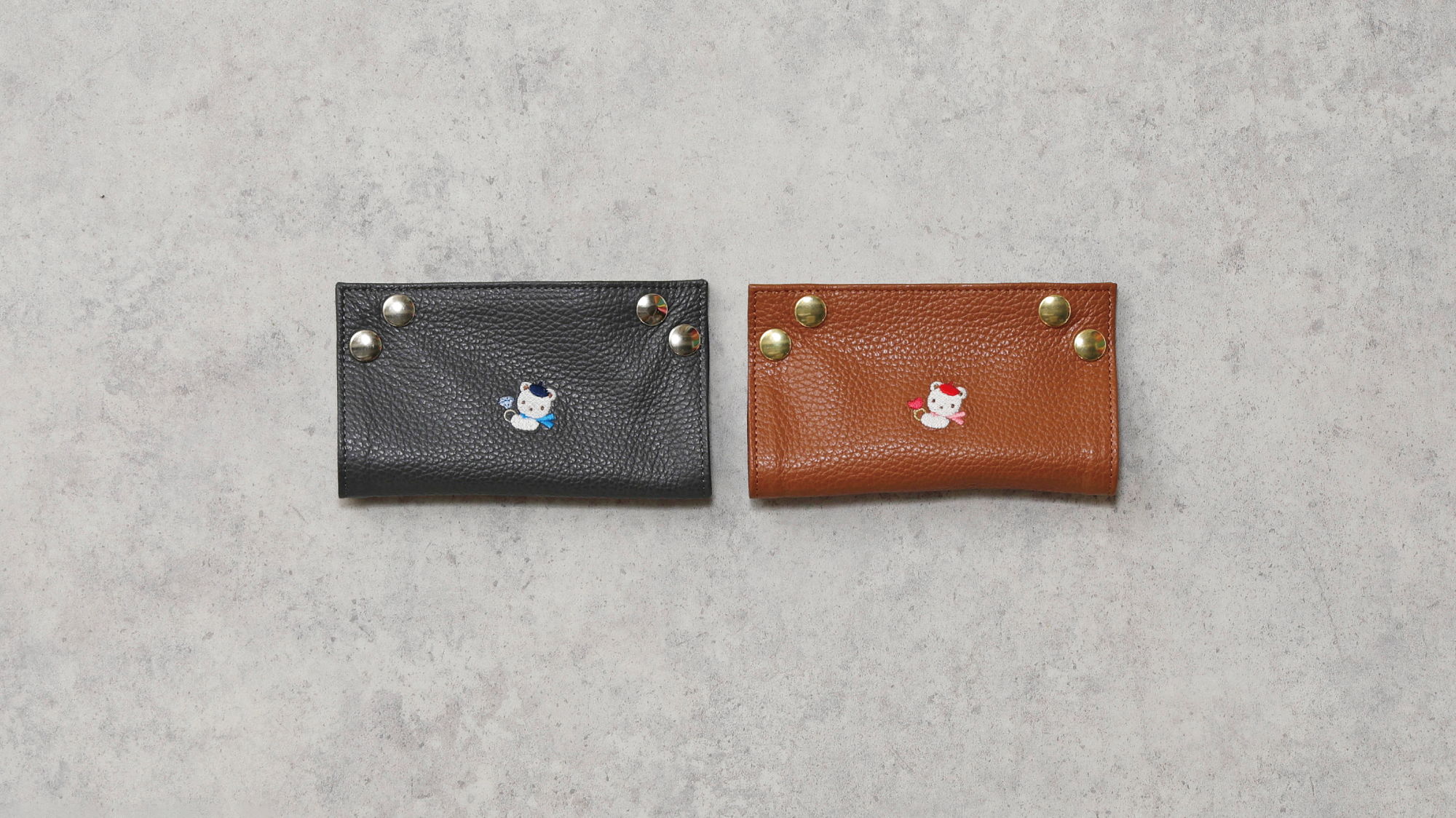 リングを持ったクマちゃんの刺しゅうと箔押しのfamiliarロゴがポイントです。
