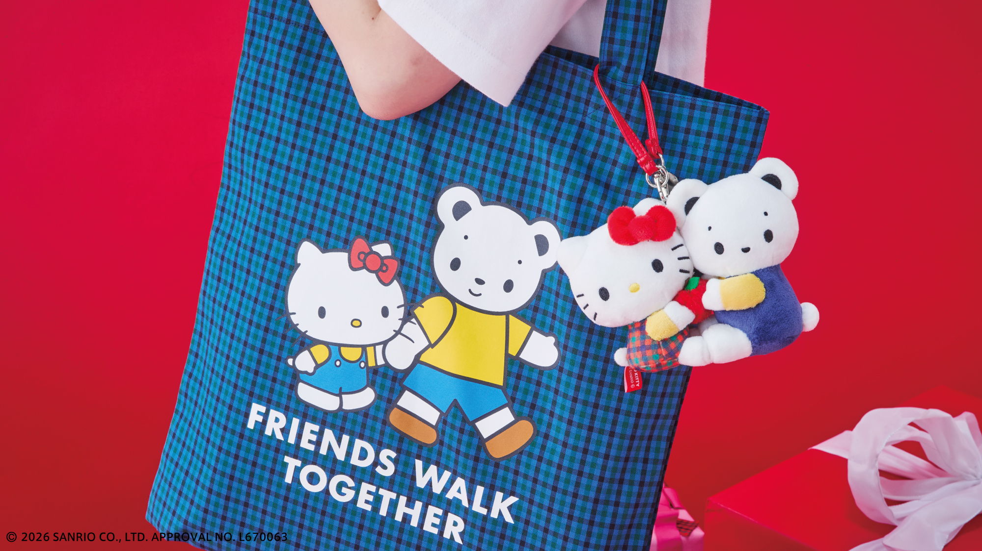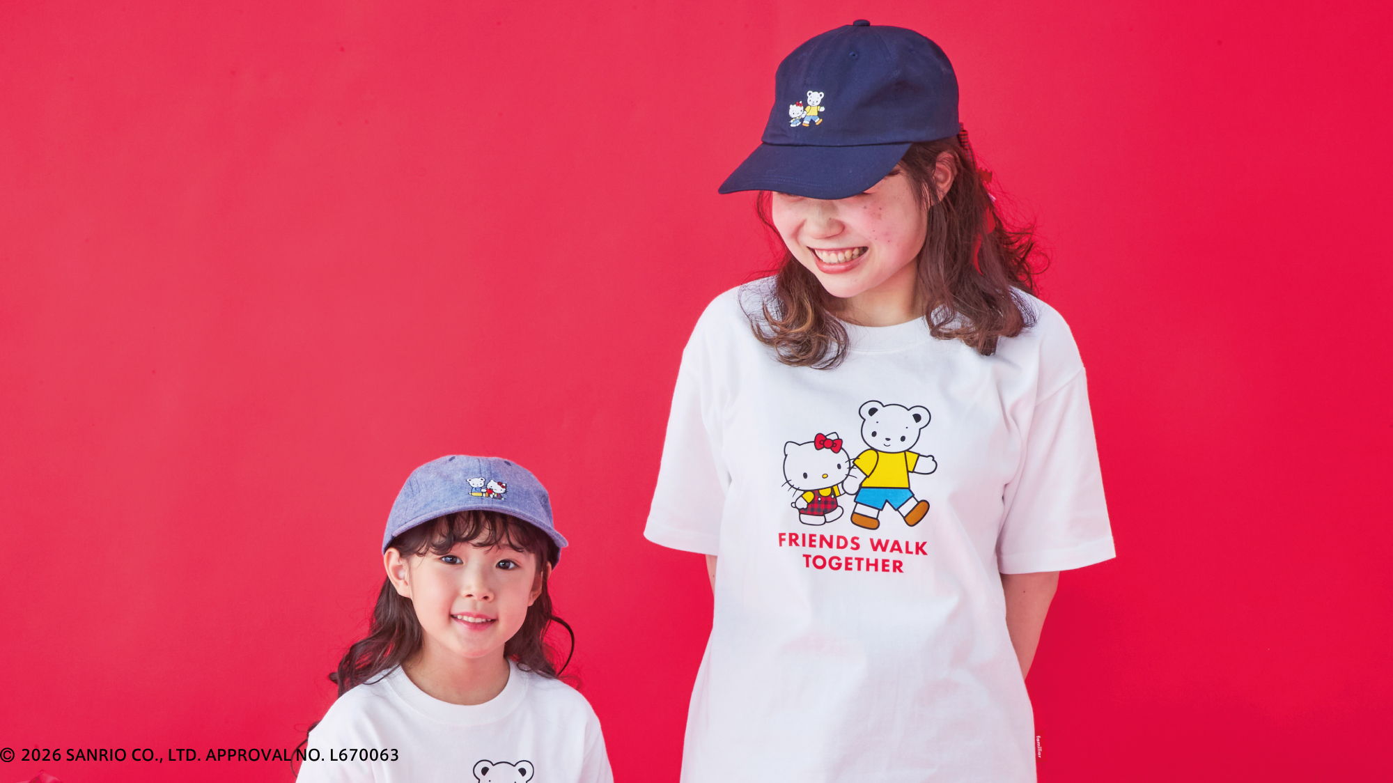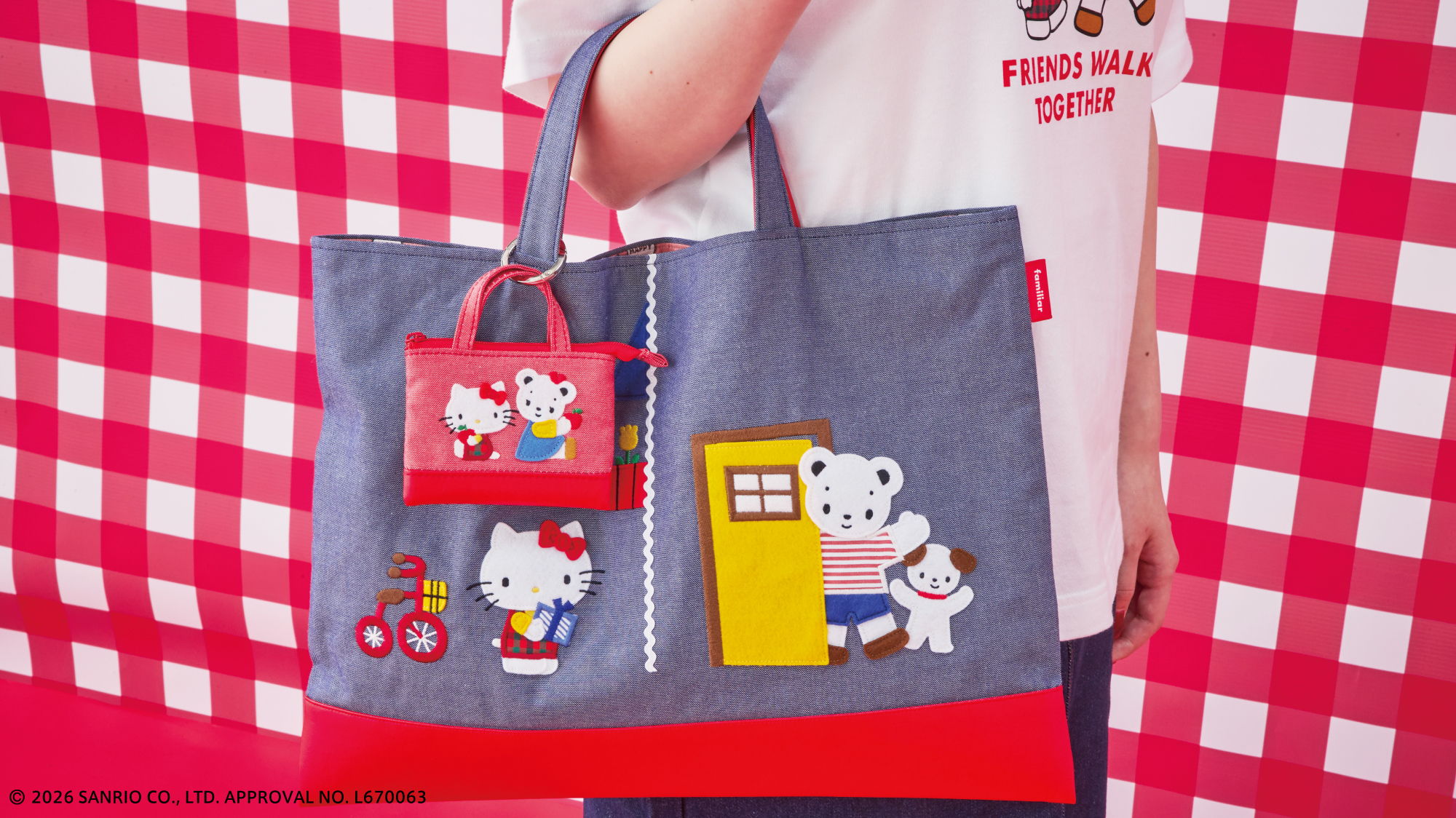 おそろいのポーズをしたファミちゃんとハローキティのアートがポイント。ファミちゃんはハローキティと同じ色のお洋服、ハローキティはファミリアチェックのお洋服を着ています。