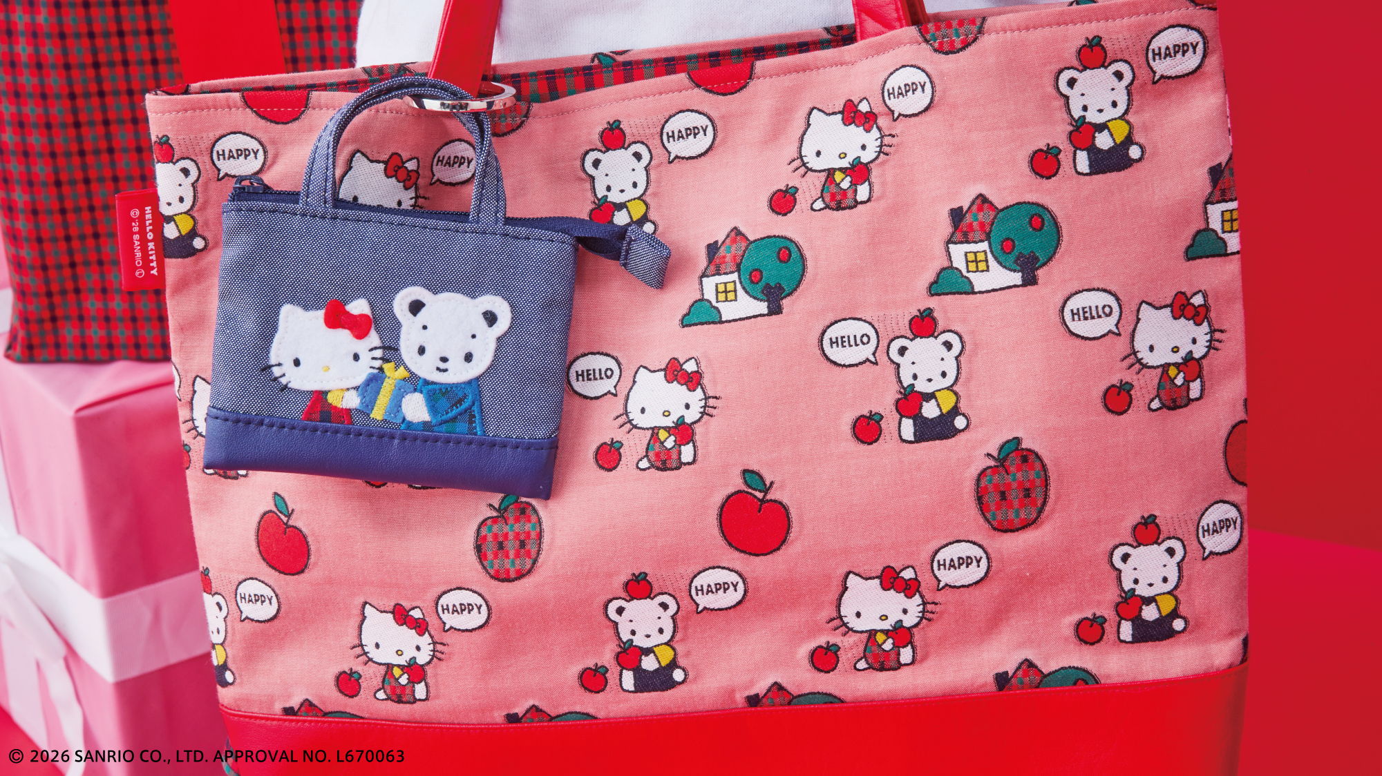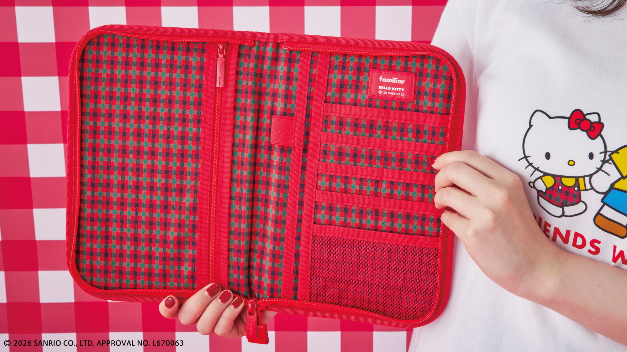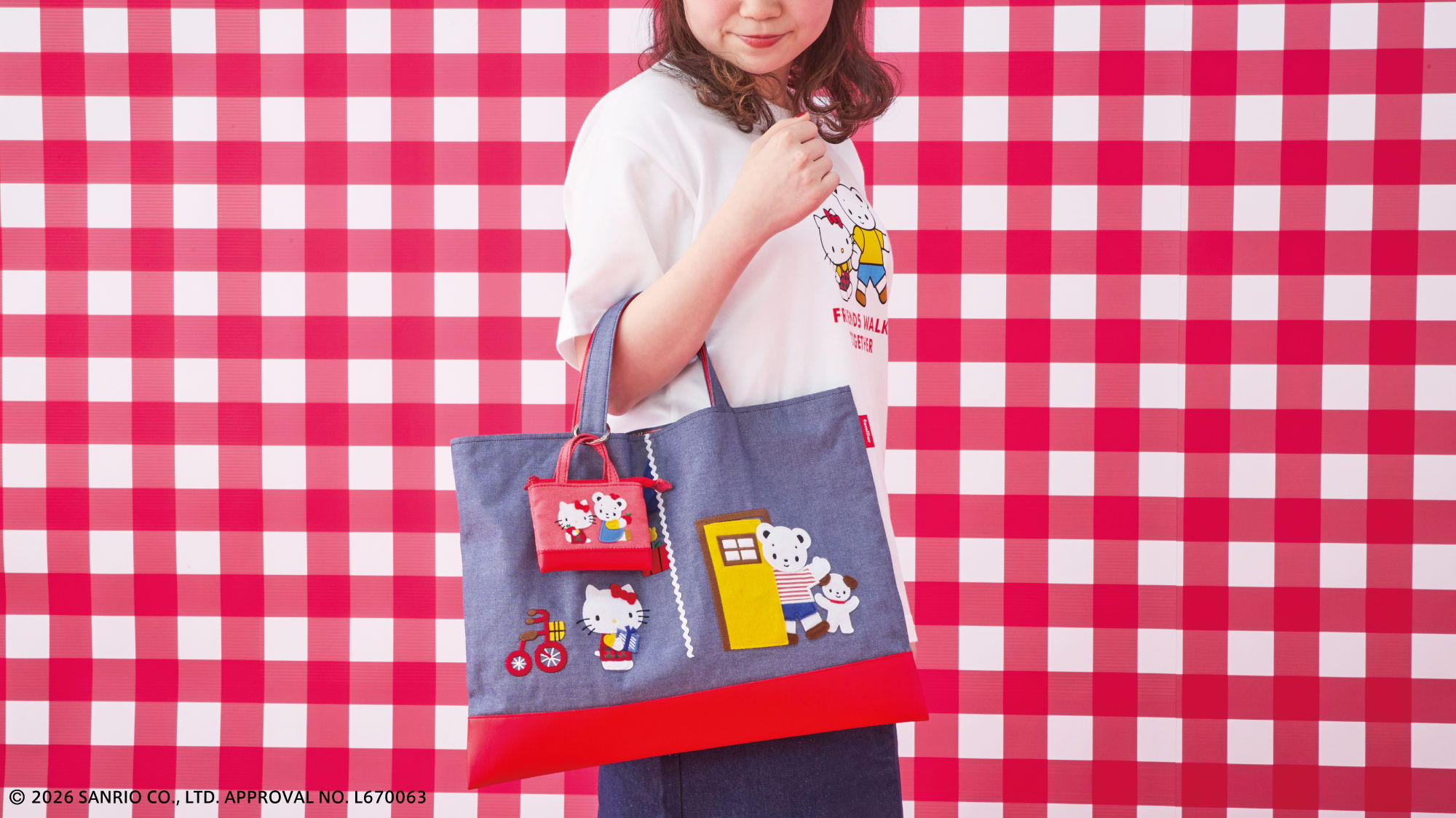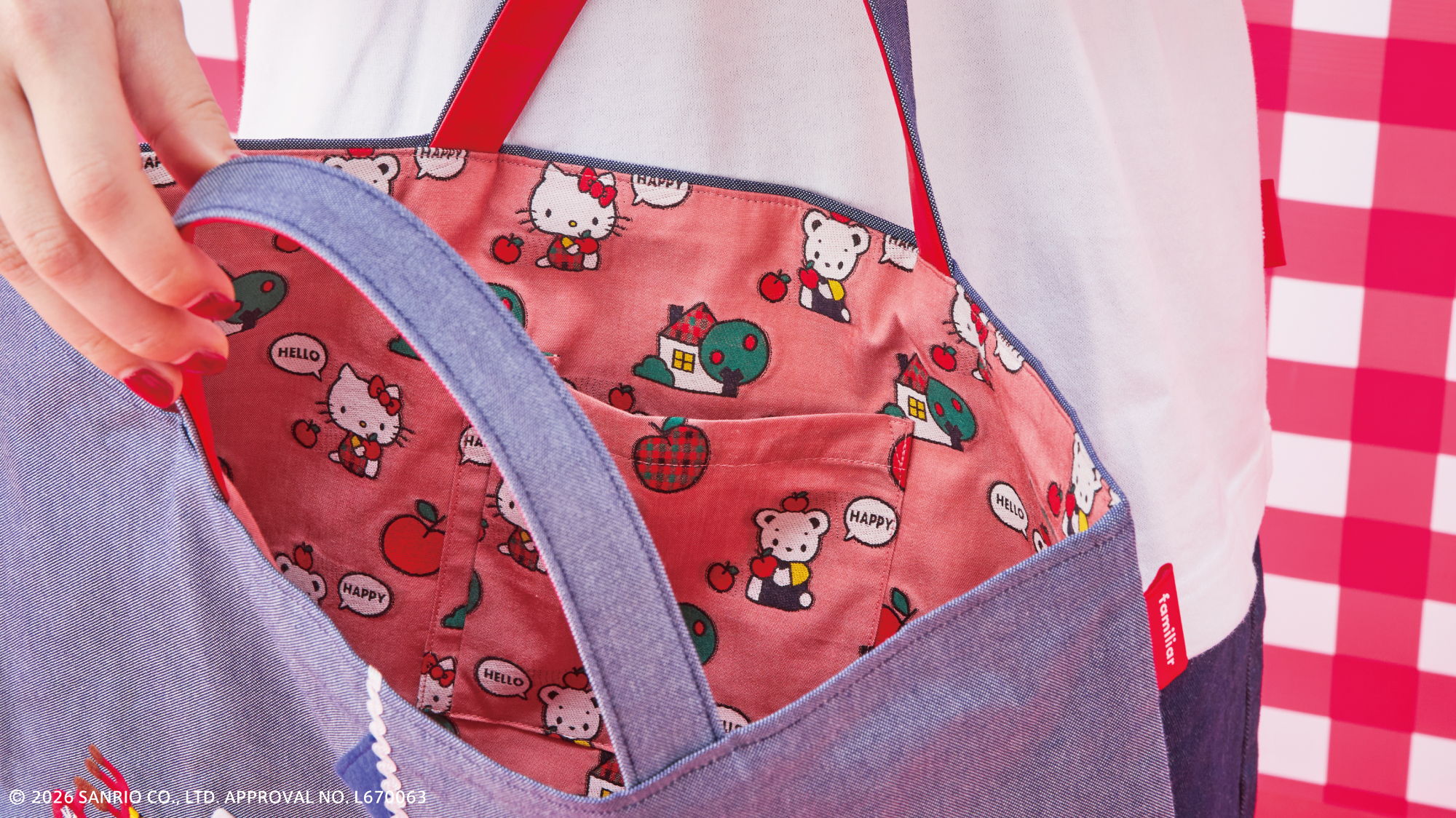 おそろいのポーズをしたファミちゃんとハローキティのアートがポイント。ファミちゃんはハローキティと同じ色のお洋服、ハローキティはファミリアチェックのお洋服を着ています。