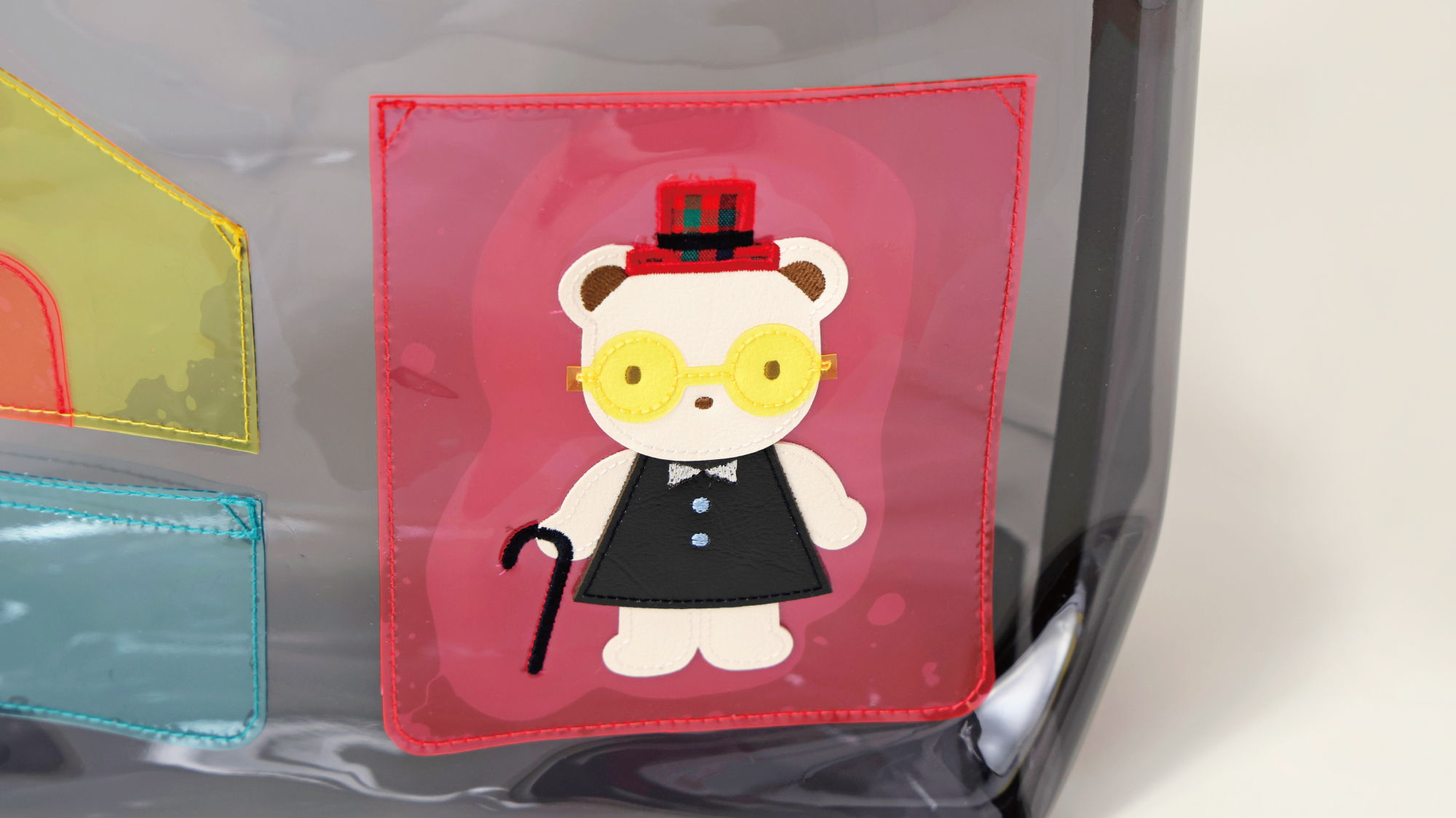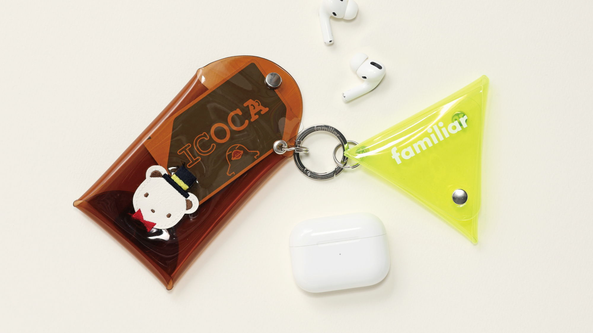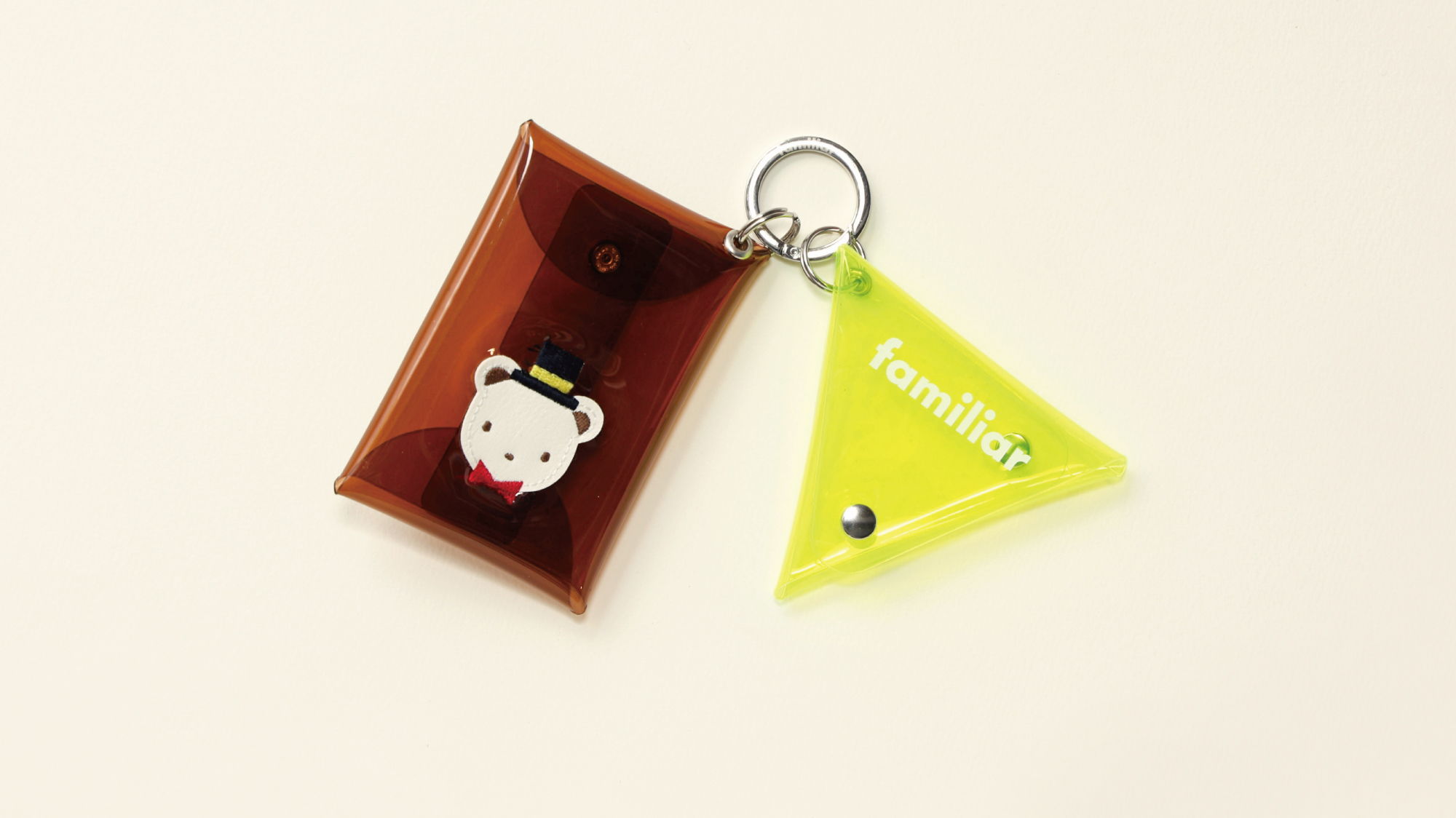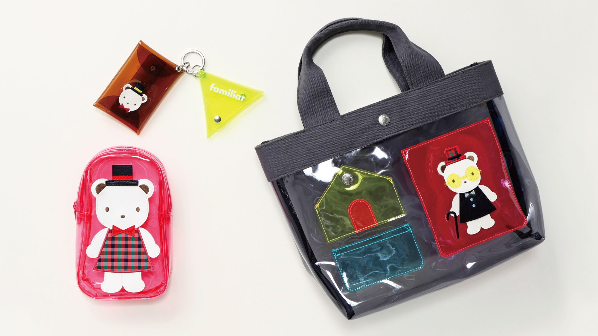 コーディネートのアクセントにぴったりなチャーム。クリア素材にプリントしたファミリアロゴと合成皮革のクマちゃんワッペンがポイントです。お気に入りのアイテムを入れて、自分らしいアレンジもお楽しみいただけます。
