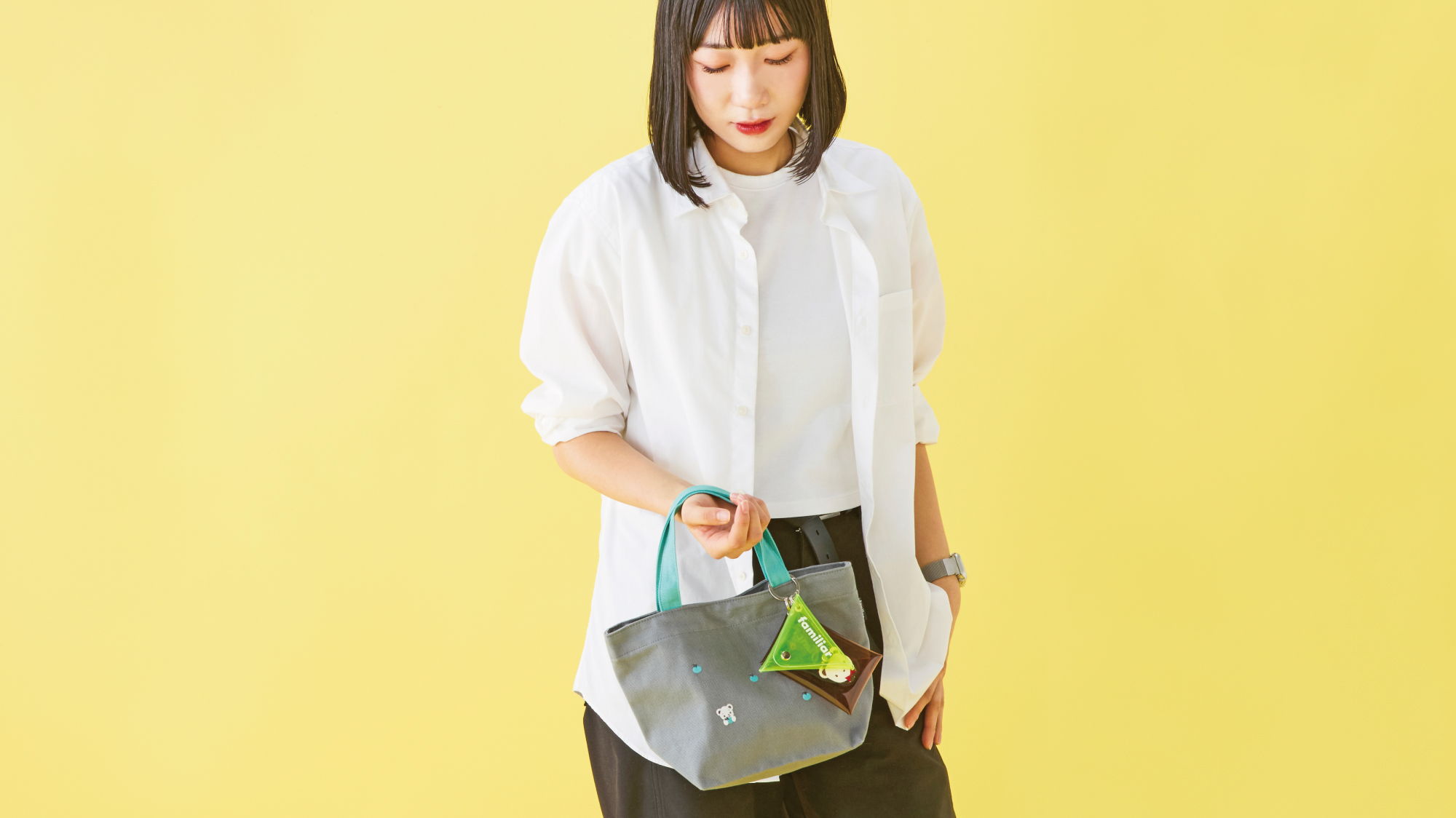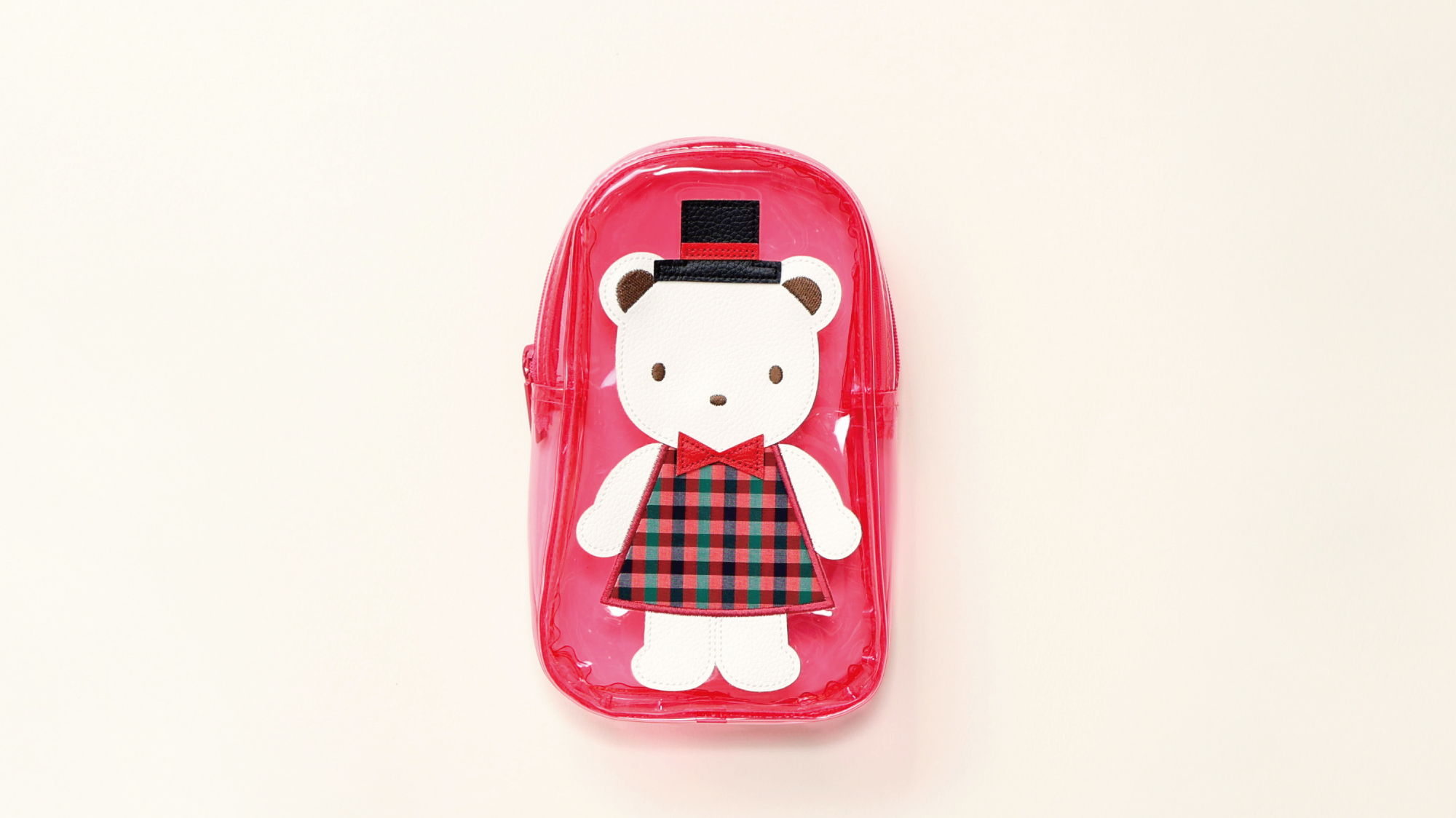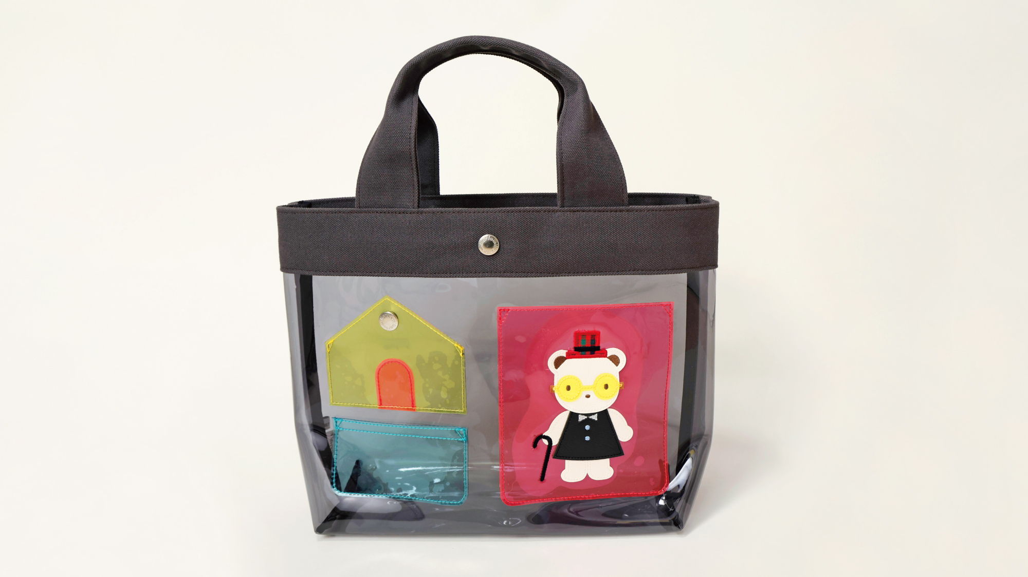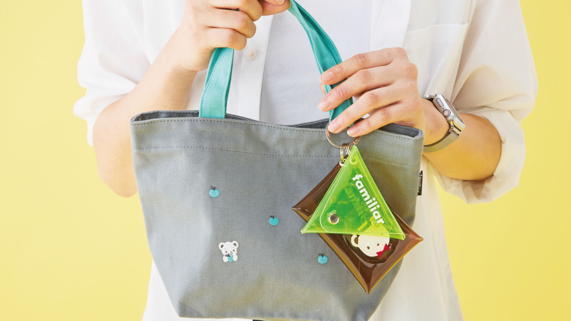 コーディネートのアクセントにぴったりなチャーム。クリア素材にプリントしたファミリアロゴと合成皮革のクマちゃんワッペンがポイントです。お気に入りのアイテムを入れて、自分らしいアレンジもお楽しみいただけます。