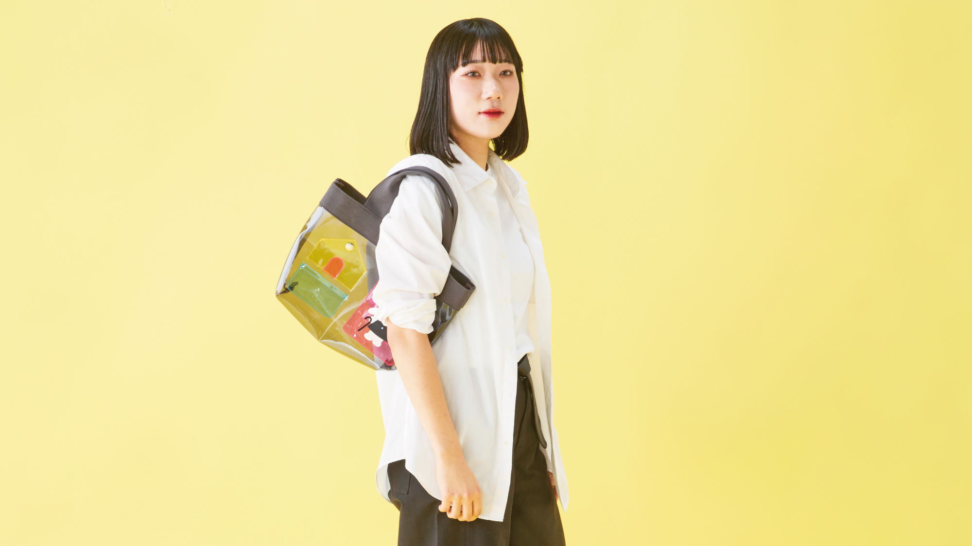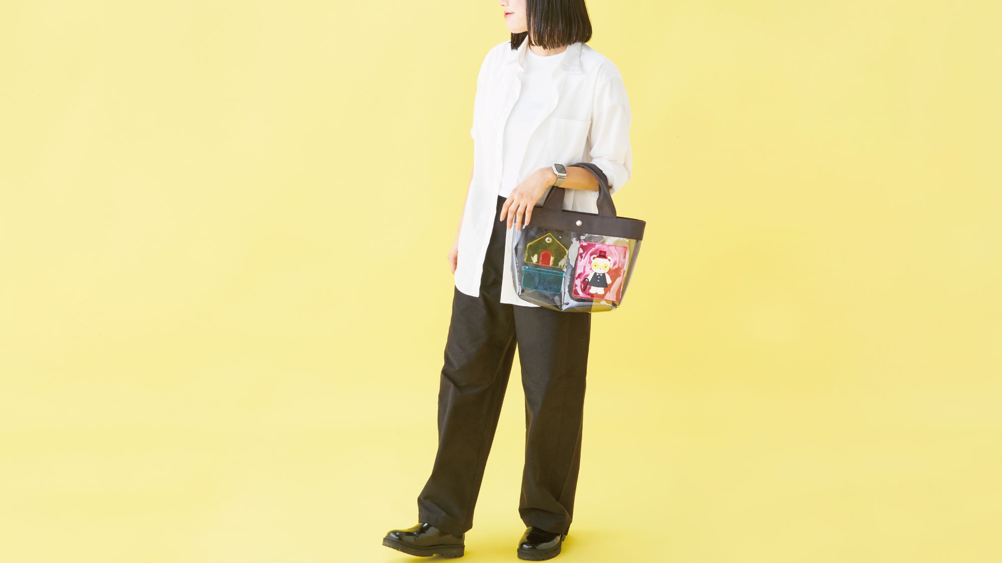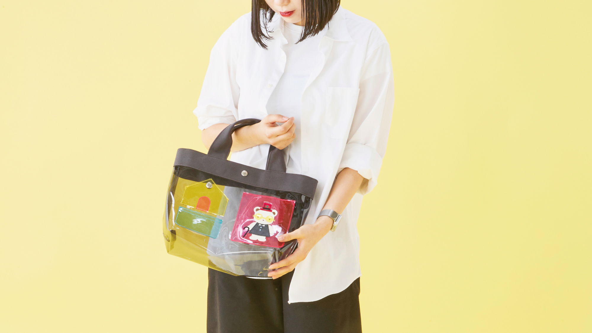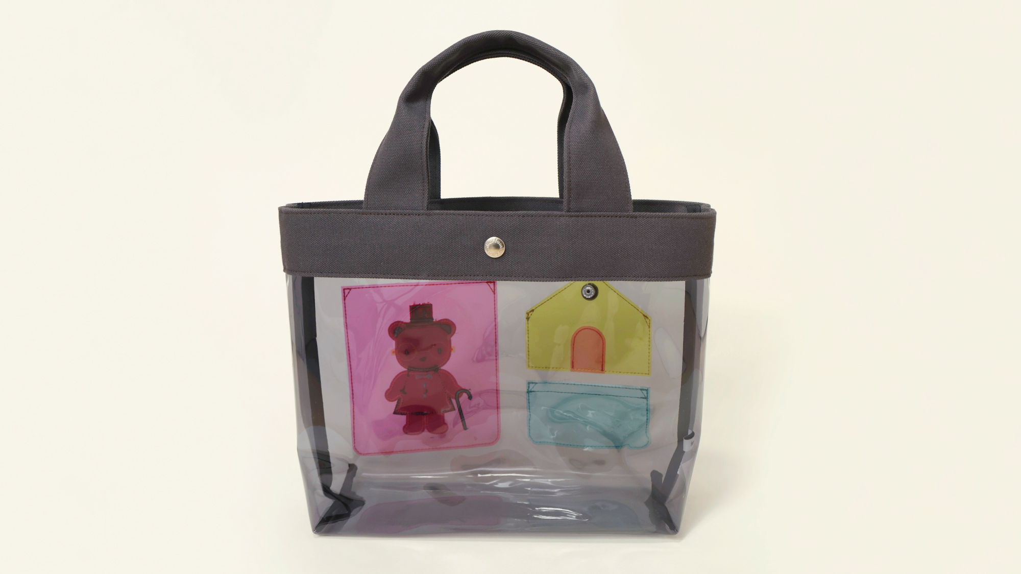 カラフルなクリア素材が夏のおでかけにぴったりのバッグ。マチ付きで、A4サイズが収納できるサイズです。