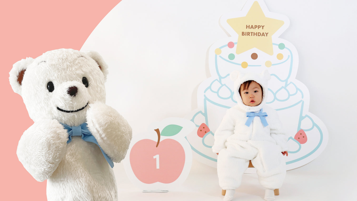 撮影会の後半には、お祝いにファミちゃんが遊びに来てくれるので、一緒に撮影もしていただけます。