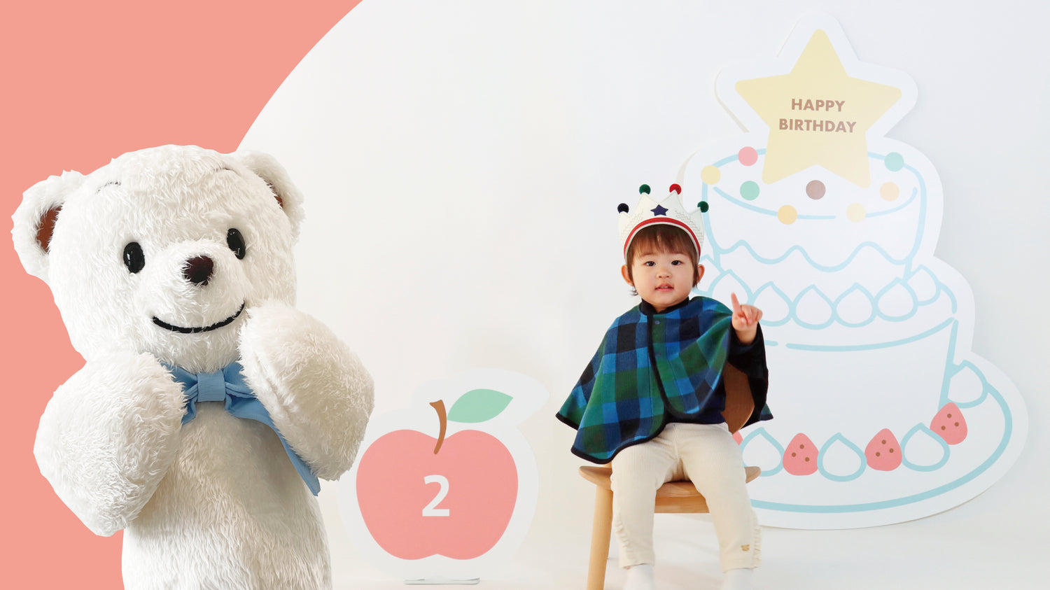 撮影会の後半には、お祝いにファミちゃんが遊びに来てくれるので、一緒に撮影もしていただけます。