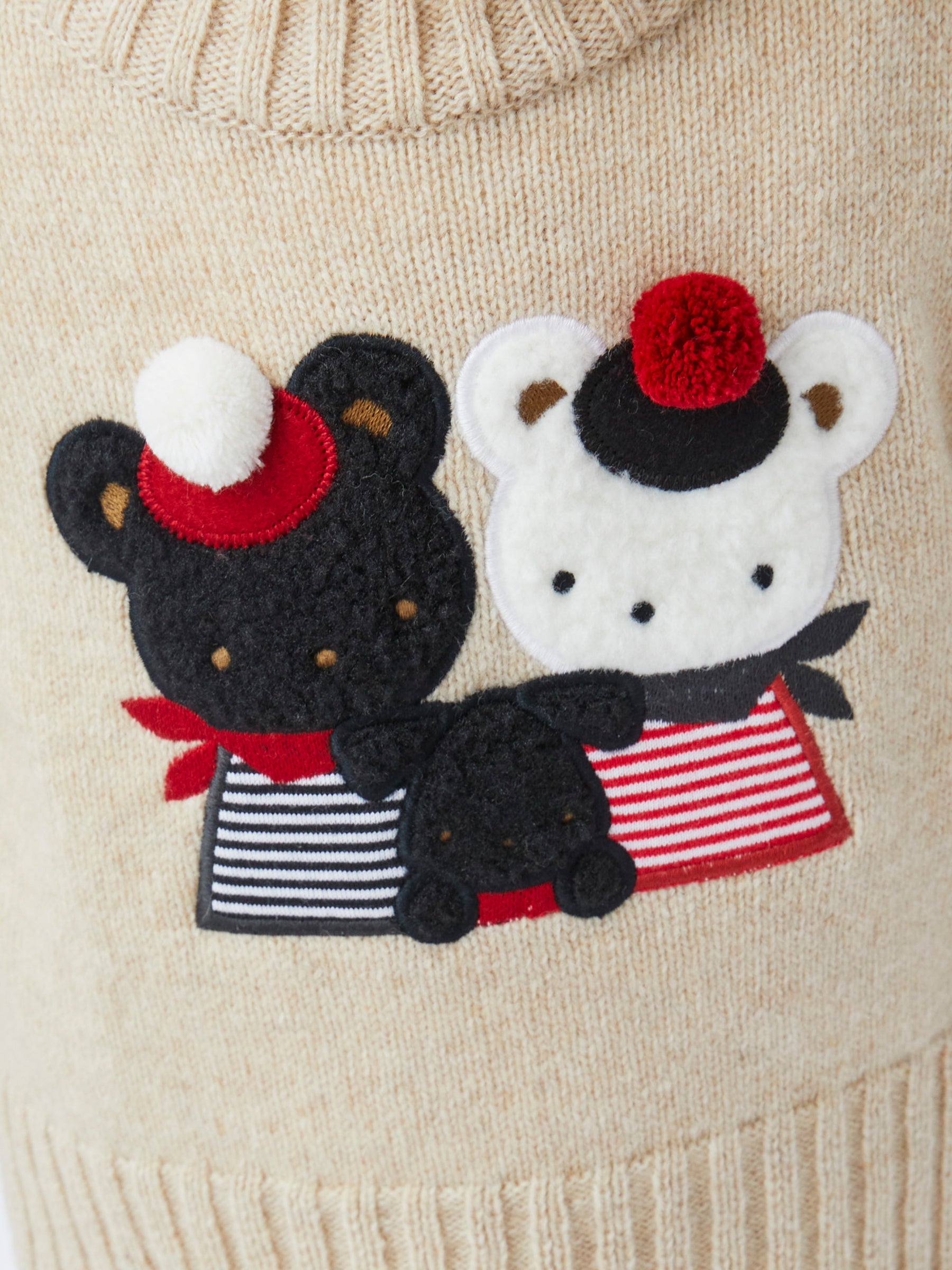 アートは、異素材を組み合わせたアップリケで仲良しのクマちゃんとテリアちゃんを表現しています。